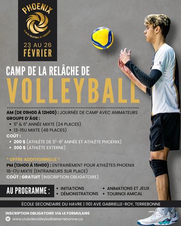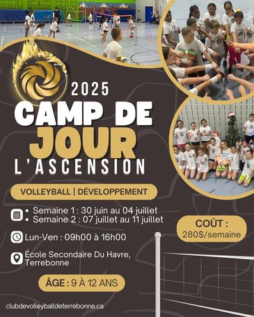 Nouveau service offert par le Club de Volleyball de Terrebonne, soit un camp de jour axé sur l'apprentissage du volleyball, pour les jeunes entre 9 et 12 ans.