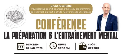 Échangez avec Bruno Ouellette, psychologue sportif et ancien athlète du programme de volleyball du Vert & Or de l'Université de Sherbrooke, et découvrez des outils concrets pour mieux gérer le stress, optimiser votre préparation avant les compétitions et votre performance.